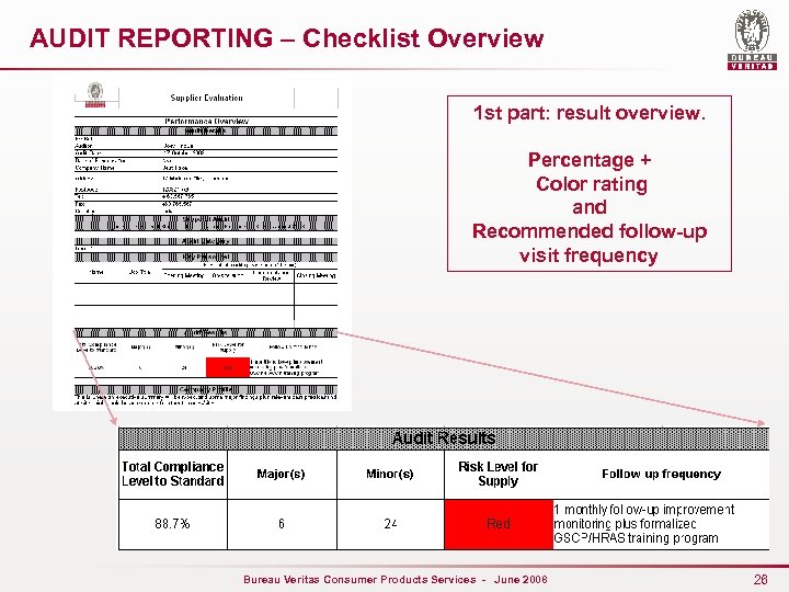 AUDIT REPORTING – Checklist Overview 1 st part: result overview. Percentage + Color rating and Recommended follow-up visit frequency Bureau Veritas Consumer Products Services - June 2008 26