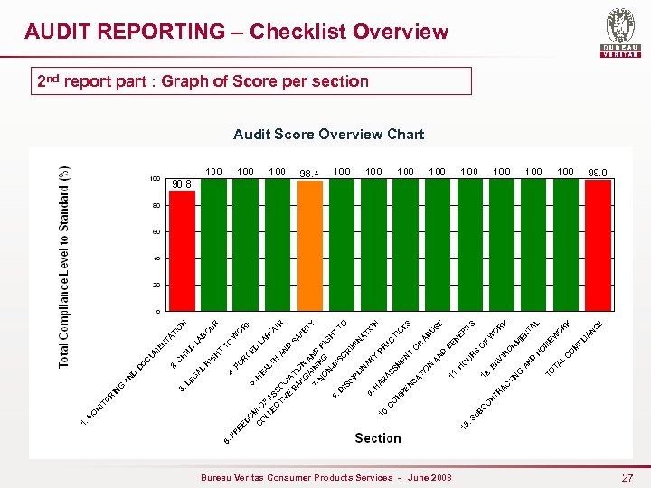 AUDIT REPORTING – Checklist Overview 2 nd report part : Graph of Score per section Audit Score Overview Chart Bureau Veritas Consumer Products Services - June 2008 27