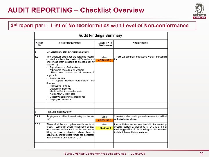 AUDIT REPORTING – Checklist Overview 2 nd report part (cont’d) : Matrix of Degree of Compliance per section Bureau Veritas Consumer Products Services - June 2008 28