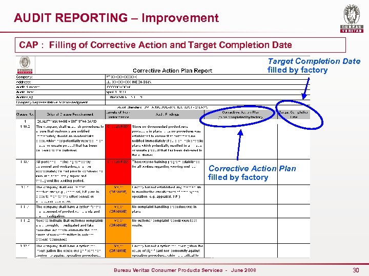 AUDIT REPORTING – Improvement CAP : Filling of Corrective Action and Target Completion Date filled by factory Corrective Action Plan filled by factory Bureau Veritas Consumer Products Services - June 2008 30