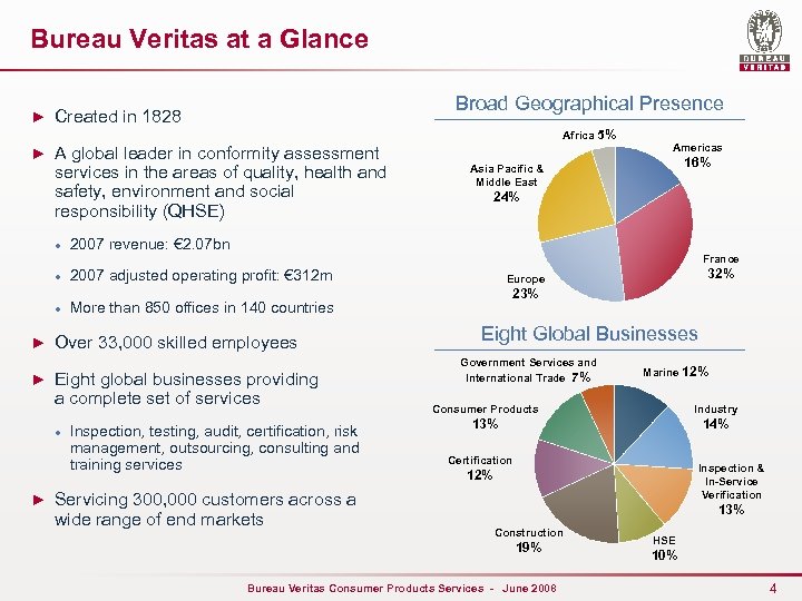 Bureau Veritas at a Glance Broad Geographical Presence ► Created in 1828 Africa 5% ► A global leader in conformity assessment services in the areas of quality, health and safety, environment and social responsibility (QHSE) l l l 16% Asia Pacific & Middle East 24% 2007 revenue: € 2. 07 bn France 2007 adjusted operating profit: € 312 m ► Eight global businesses providing a complete set of services Inspection, testing, audit, certification, risk management, outsourcing, consulting and training services 32% Europe 23% More than 850 offices in 140 countries ► Over 33, 000 skilled employees l Americas Eight Global Businesses Government Services and International Trade 7% Marine 12% Consumer Products Industry 13% 14% Certification Inspection & In-Service Verification 12% ► Servicing 300, 000 customers across a wide range of end markets 13% Construction 19% Bureau Veritas Consumer Products Services - June 2008 HSE 10% 4