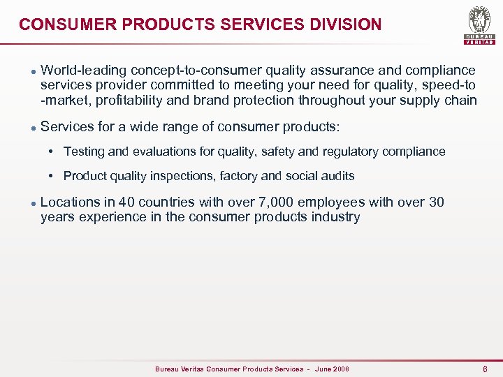 Extensive Geographic Footprint Americas Europe (excl. France) n 140 offices, including 26 laboratories n 290 offices, including 41 laboratories n 5, 700 staff n 8, 600 staff France n 175 offices, including 12 laboratories n 7, 200 staff Asia & Middle East n 190 offices, including 58 laboratories n 10, 500 staff Africa n 55 offices, including 9 laboratories n 1, 000 staff Global network comprising more than 850 locations across 140 countries Bureau Veritas Consumer Products Services - June 2008 5