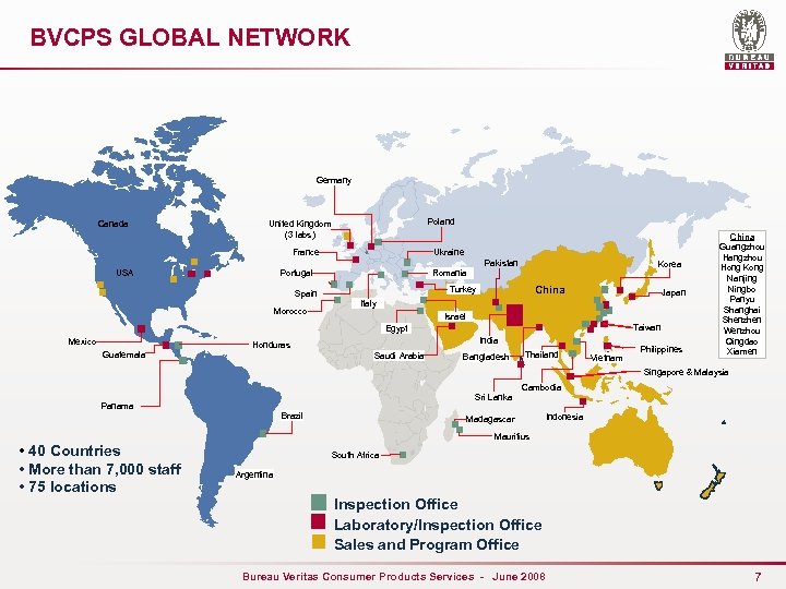CONSUMER PRODUCTS SERVICES DIVISION l l World-leading concept-to-consumer quality assurance and compliance services provider committed to meeting your need for quality, speed-to -market, profitability and brand protection throughout your supply chain Services for a wide range of consumer products: • Testing and evaluations for quality, safety and regulatory compliance • Product quality inspections, factory and social audits l Locations in 40 countries with over 7, 000 employees with over 30 years experience in the consumer products industry Bureau Veritas Consumer Products Services - June 2008 6