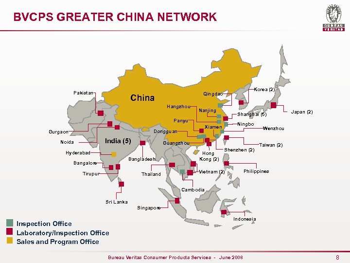 BVCPS GLOBAL NETWORK Germany Canada Poland United Kingdom (3 labs) Ukraine France Pakistan Portugal USA Spain Morocco Korea Romania China Turkey Japan Italy Israel Taiwan Egypt Mexico India Honduras Guatemala Saudi Arabia Bangladesh Thailand Vietnam Philippines China Guangzhou Hong Kong Nanjing Ningbo Panyu Shanghai Shenzhen Wenzhou Qingdao Xiamen Singapore & Malaysia Sri Lanka Panama Brazil Cambodia Madagascar Indonesia Mauritius • 40 Countries • More than 7, 000 staff • 75 locations South Africa Argentina Inspection Office Laboratory/Inspection Office Sales and Program Office Bureau Veritas Consumer Products Services - June 2008 7