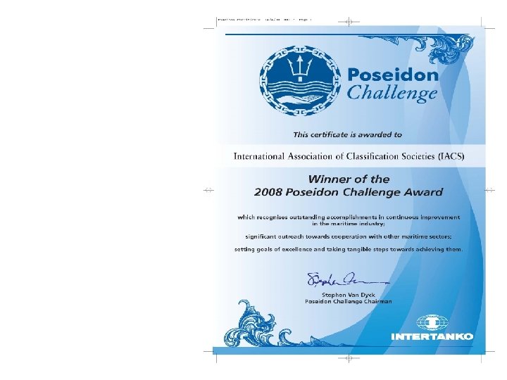 Tripartite talks • Class – IACS Chairman and some Council members • Shipbuilders – from China, Europe, Japan, Korea • Ship owners – Round Table of int’l shipping assoc’ns (BIMCO, ICS, Intercargo, Intertanko) Working together for - Continuous improvement - Sharing best practice - Formulating practical measures for self-regulation - Recycling - Cadet accomodation - GHG reductions