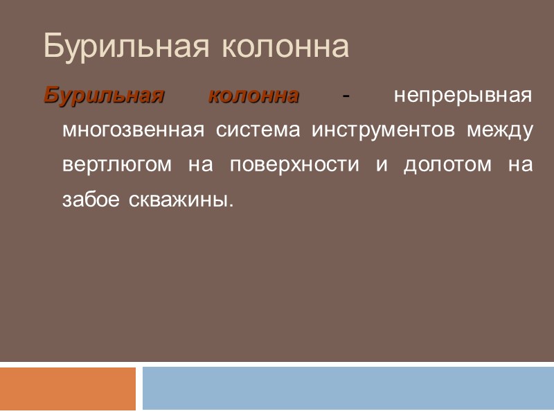 Бурильная колонна Бурильная колонна - непрерывная многозвенная система инструментов между вертлюгом на поверхности и долотом на забое скважины.