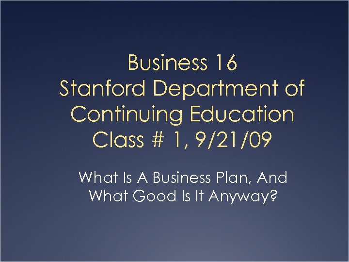 Business 16 Stanford Department of Continuing Education Class # 1, 9/21/09 What Is A Business Plan, And What Good Is It Anyway?