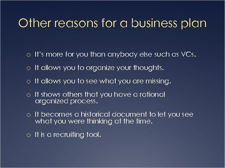 Other reasons for a business plan o It’s more for you than anybody else such as VCs. o It allows you to organize your thoughts. o It allows you to see what you are missing. o It shows others that you have a rational organized process. o It becomes a historical document to let you see what you were thinking at the time. o It is a recruiting tool.