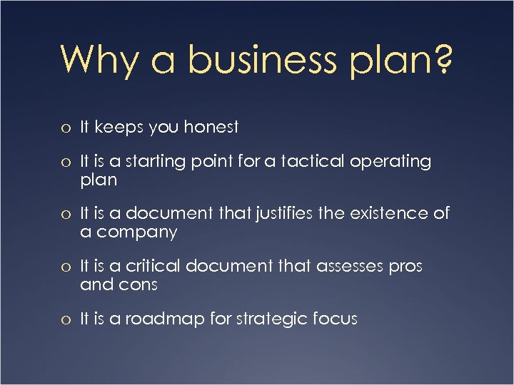 Why a business plan? o It keeps you honest o It is a starting point for a tactical operating plan o It is a document that justifies the existence of a company o It is a critical document that assesses pros and cons o It is a roadmap for strategic focus