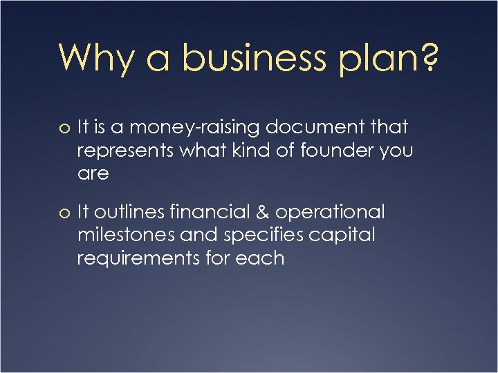 Why a business plan? o It is a money-raising document that represents what kind of founder you are o It outlines financial & operational milestones and specifies capital requirements for each