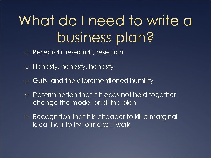 What do I need to write a business plan? o Research, research o Honesty, honesty o Guts, and the aforementioned humility o Determination that if it does not hold together, change the model or kill the plan o Recognition that it is cheaper to kill a marginal idea than to try to make it work