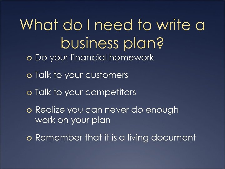 What do I need to write a business plan? o Do your financial homework o Talk to your customers o Talk to your competitors o Realize you can never do enough work on your plan o Remember that it is a living document