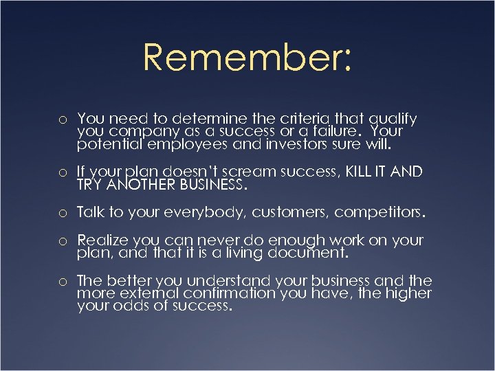 Remember: o You need to determine the criteria that qualify you company as a success or a failure. Your potential employees and investors sure will. o If your plan doesn’t scream success, KILL IT AND TRY ANOTHER BUSINESS. o Talk to your everybody, customers, competitors. o Realize you can never do enough work on your plan, and that it is a living document. o The better you understand your business and the more external confirmation you have, the higher your odds of success.