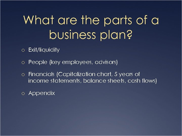 What are the parts of a business plan? o Exit/liquidity o People (key employees, advisors) o Financials (Capitalization chart, 5 years of income statements, balance sheets, cash flows) o Appendix