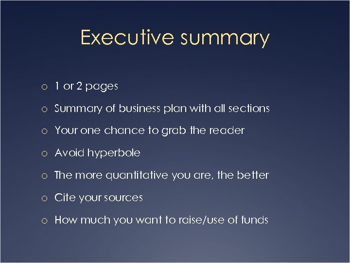 Executive summary o 1 or 2 pages o Summary of business plan with all sections o Your one chance to grab the reader o Avoid hyperbole o The more quantitative you are, the better o Cite your sources o How much you want to raise/use of funds