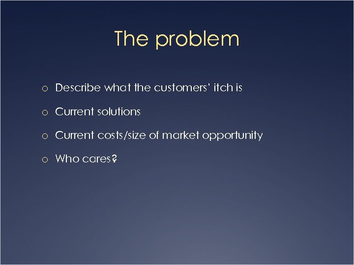 The problem o Describe what the customers’ itch is o Current solutions o Current costs/size of market opportunity o Who cares?