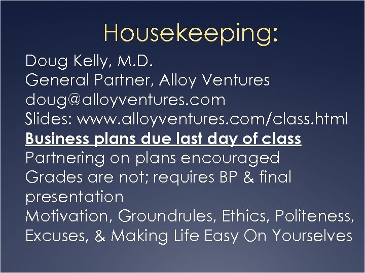 Housekeeping: Doug Kelly, M. D. General Partner, Alloy Ventures doug@alloyventures. com Slides: www. alloyventures. com/class. html Business plans due last day of class Partnering on plans encouraged Grades are not; requires BP & final presentation Motivation, Groundrules, Ethics, Politeness, Excuses, & Making Life Easy On Yourselves