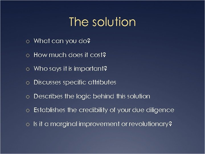 The solution o What can you do? o How much does it cost? o Who says it is important? o Discusses specific attributes o Describes the logic behind this solution o Establishes the credibility of your due diligence o Is it a marginal improvement or revolutionary?