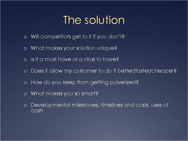 The solution o Will competitors get to it if you don’t? o What makes your solution unique? o Is it a must have or a nice to have? o Does it allow my customer to do it better/faster/cheaper? o How do you keep from getting pulverized? o What makes you so smart? o Developmental milestones, timelines and costs, uses of cash