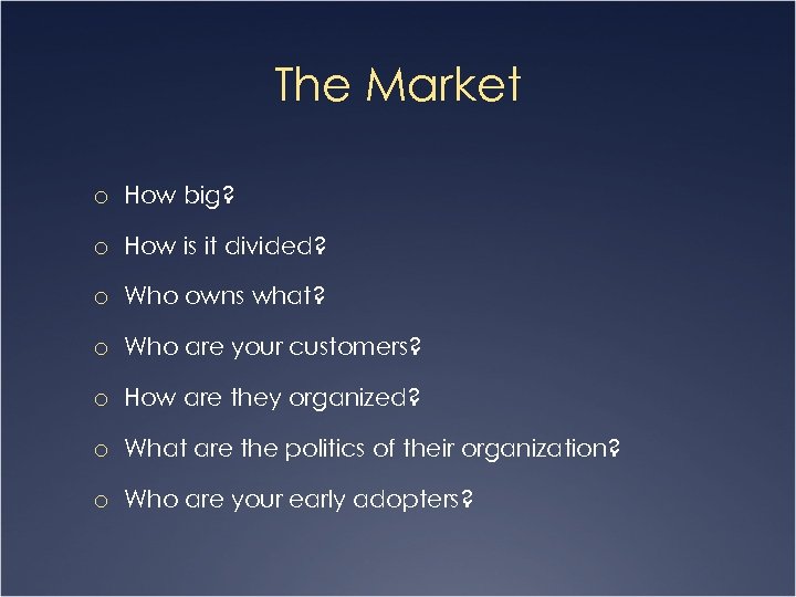 The Market o How big? o How is it divided? o Who owns what? o Who are your customers? o How are they organized? o What are the politics of their organization? o Who are your early adopters?