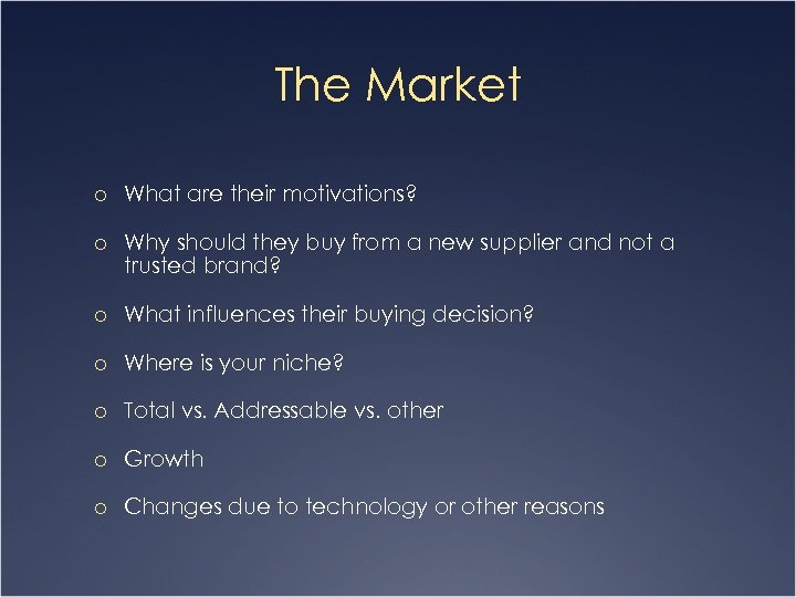 The Market o What are their motivations? o Why should they buy from a new supplier and not a trusted brand? o What influences their buying decision? o Where is your niche? o Total vs. Addressable vs. other o Growth o Changes due to technology or other reasons