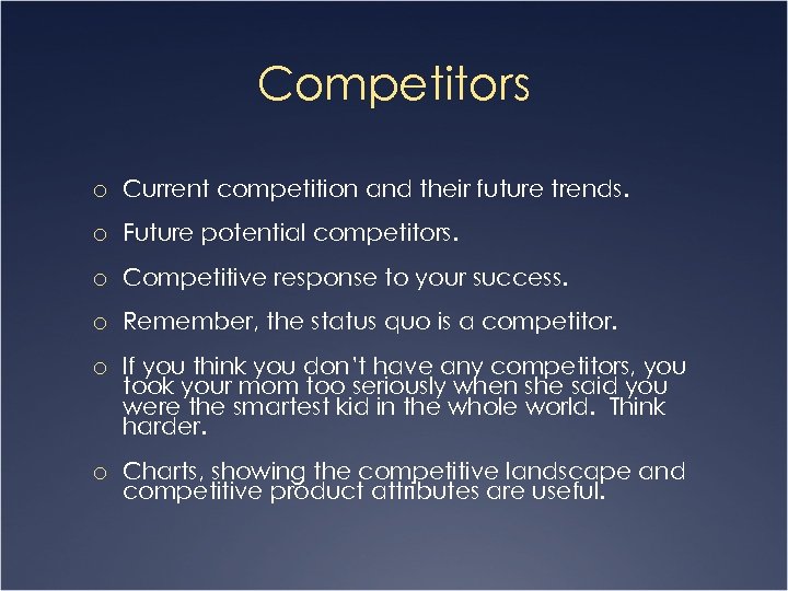 Competitors o Current competition and their future trends. o Future potential competitors. o Competitive response to your success. o Remember, the status quo is a competitor. o If you think you don’t have any competitors, you took your mom too seriously when she said you were the smartest kid in the whole world. Think harder. o Charts, showing the competitive landscape and competitive product attributes are useful.