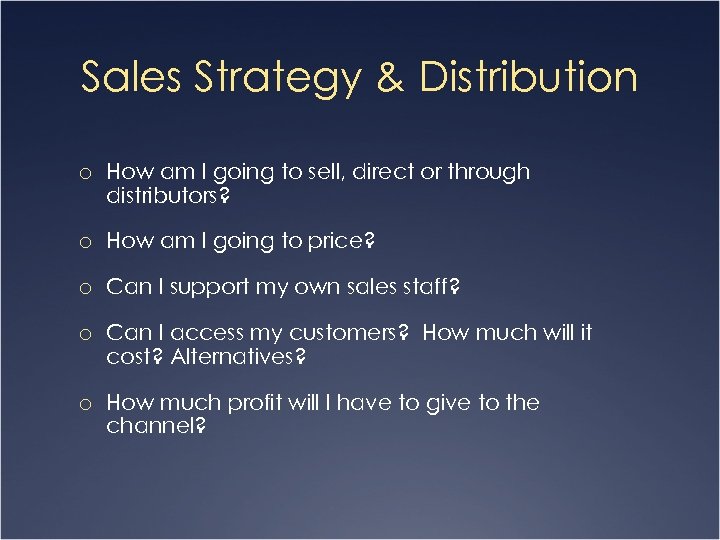 Sales Strategy & Distribution o How am I going to sell, direct or through distributors? o How am I going to price? o Can I support my own sales staff? o Can I access my customers? How much will it cost? Alternatives? o How much profit will I have to give to the channel?
