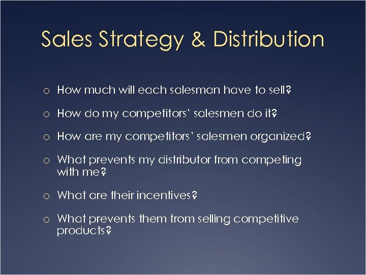 Sales Strategy & Distribution o How much will each salesman have to sell? o How do my competitors’ salesmen do it? o How are my competitors’ salesmen organized? o What prevents my distributor from competing with me? o What are their incentives? o What prevents them from selling competitive products?