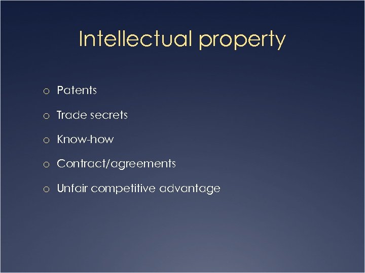 Intellectual property o Patents o Trade secrets o Know-how o Contract/agreements o Unfair competitive advantage