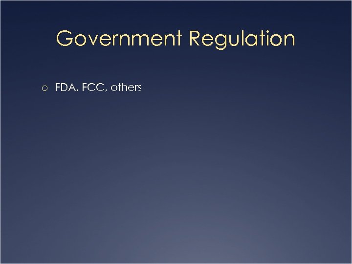 Government Regulation o FDA, FCC, others