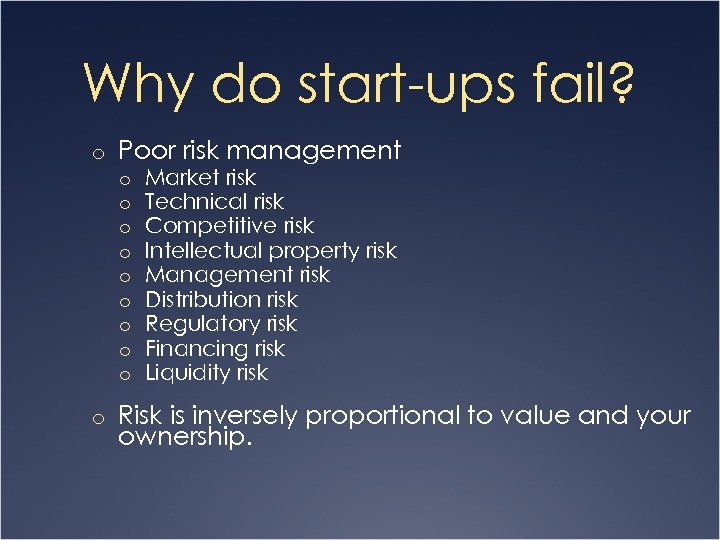 Why do start-ups fail? o Poor risk management o o o o o Market risk Technical risk Competitive risk Intellectual property risk Management risk Distribution risk Regulatory risk Financing risk Liquidity risk o Risk is inversely proportional to value and your ownership.