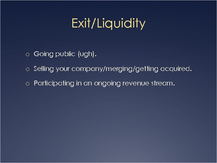 Exit/Liquidity o Going public (ugh). o Selling your company/merging/getting acquired. o Participating in an ongoing revenue stream.