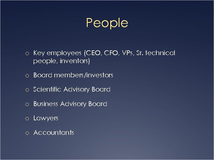 People o Key employees (CEO, CFO, VPs, Sr. technical people, inventors) o Board members/investors o Scientific Advisory Board o Business Advisory Board o Lawyers o Accountants