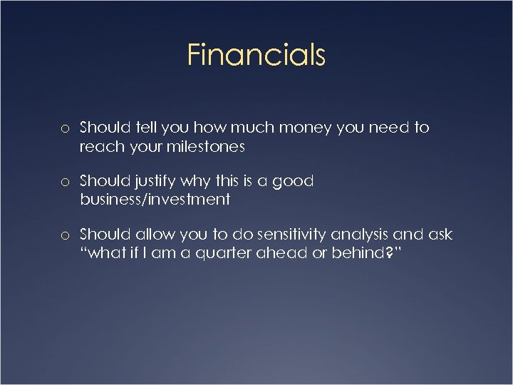 Financials o Should tell you how much money you need to reach your milestones o Should justify why this is a good business/investment o Should allow you to do sensitivity analysis and ask “what if I am a quarter ahead or behind? ”
