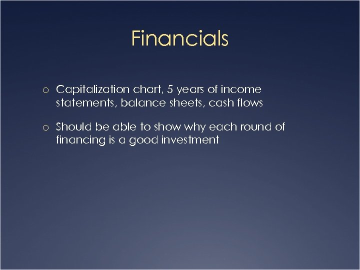 Financials o Capitalization chart, 5 years of income statements, balance sheets, cash flows o Should be able to show why each round of financing is a good investment