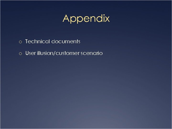 Appendix o Technical documents o User illusion/customer scenario