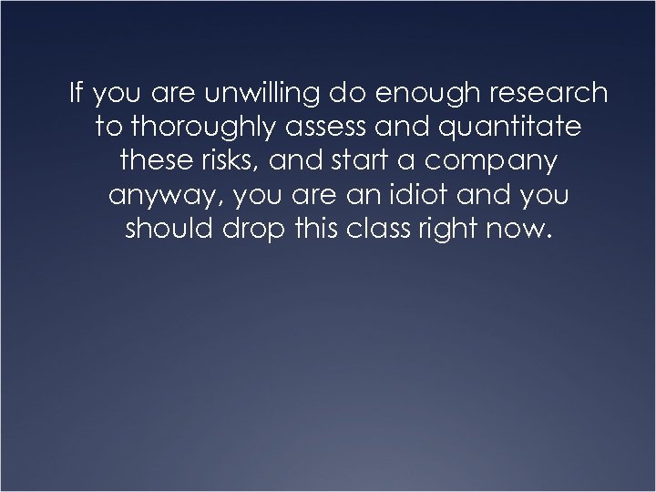 If you are unwilling do enough research to thoroughly assess and quantitate these risks, and start a company anyway, you are an idiot and you should drop this class right now.