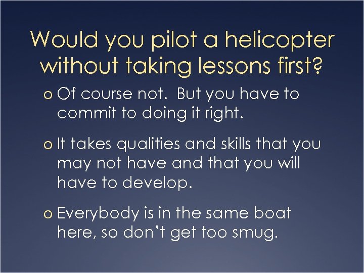 Would you pilot a helicopter without taking lessons first? o Of course not. But you have to commit to doing it right. o It takes qualities and skills that you may not have and that you will have to develop. o Everybody is in the same boat here, so don’t get too smug.