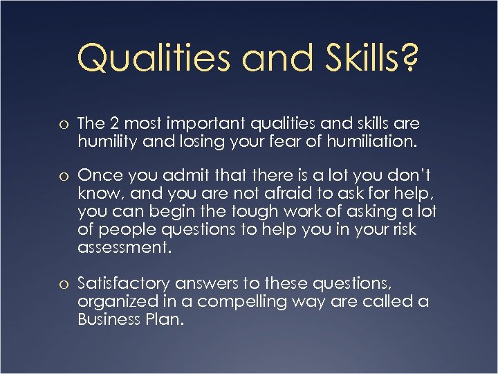 Qualities and Skills? o The 2 most important qualities and skills are humility and losing your fear of humiliation. o Once you admit that there is a lot you don’t know, and you are not afraid to ask for help, you can begin the tough work of asking a lot of people questions to help you in your risk assessment. o Satisfactory answers to these questions, organized in a compelling way are called a Business Plan.