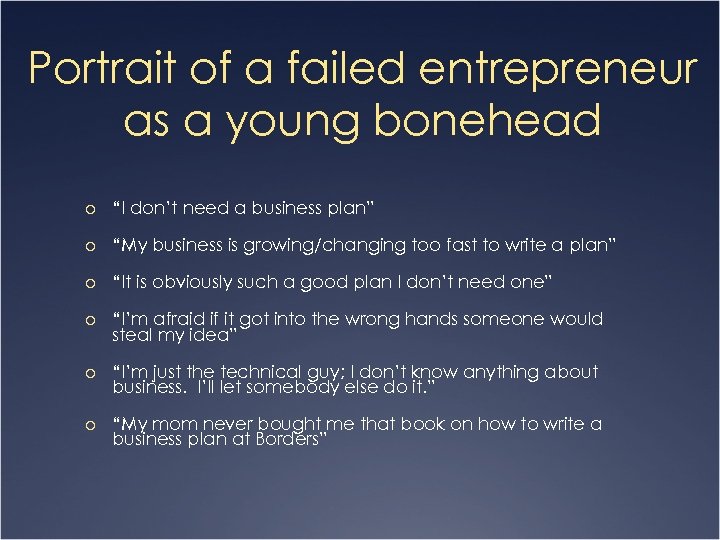 Portrait of a failed entrepreneur as a young bonehead o “I don’t need a business plan” o “My business is growing/changing too fast to write a plan” o “It is obviously such a good plan I don’t need one” o “I’m afraid if it got into the wrong hands someone would steal my idea” o “I’m just the technical guy; I don’t know anything about business. I’ll let somebody else do it. ” o “My mom never bought me that book on how to write a business plan at Borders”