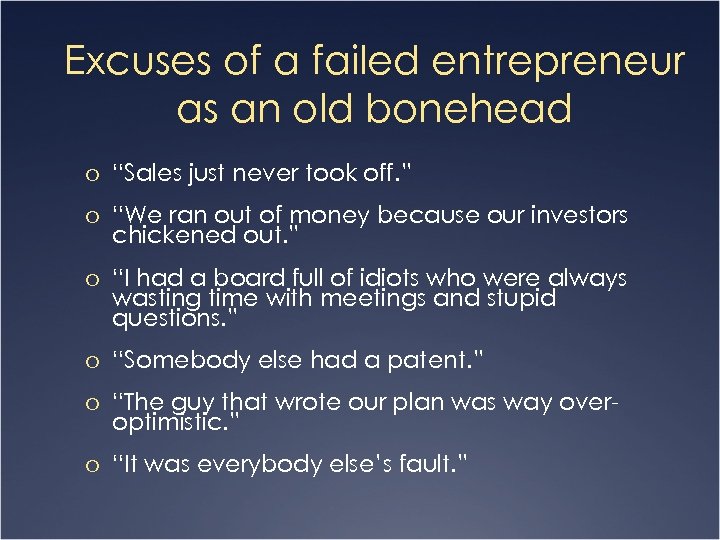 Excuses of a failed entrepreneur as an old bonehead o “Sales just never took off. ” o “We ran out of money because our investors chickened out. ” o “I had a board full of idiots who were always wasting time with meetings and stupid questions. ” o “Somebody else had a patent. ” o “The guy that wrote our plan was way over- optimistic. ” o “It was everybody else’s fault. ”