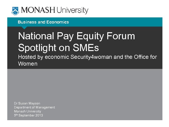 Business and Economics National Pay Equity Forum Spotlight on SMEs Hosted by economic Security 4 woman and the Office for Women Dr Susan Mayson Department of Management Monash University 5 th September 2013