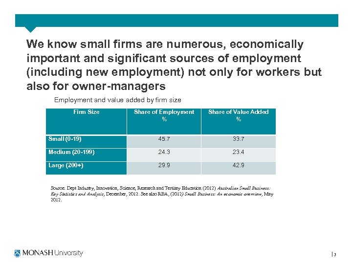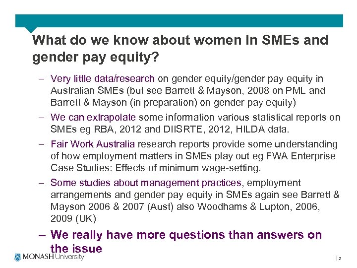 What do we know about women in SMEs and gender pay equity? – Very little data/research on gender equity/gender pay equity in Australian SMEs (but see Barrett & Mayson, 2008 on PML and Barrett & Mayson (in preparation) on gender pay equity) – We can extrapolate some information various statistical reports on SMEs eg RBA, 2012 and DIISRTE, 2012, HILDA data. – Fair Work Australia research reports provide some understanding of how employment matters in SMEs play out eg FWA Enterprise Case Studies: Effects of minimum wage-setting. – Some studies about management practices, employment arrangements and gender pay equity in SMEs again see Barrett & Mayson 2006 & 2007 (Aust) also Woodhams & Lupton, 2006, 2009 (UK) – We really have more questions than answers on the issue 2