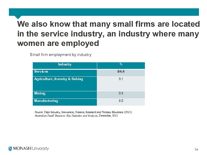We know small firms are numerous, economically important and significant sources of employment (including new employment) not only for workers but also for owner-managers Employment and value added by firm size Firm Size Share of Employment % Share of Value Added % Small (0 -19) 45. 7 33. 7 Medium (20 -199) 24. 3 23. 4 Large (200+) 29. 9 42. 9 Source: Dept Industry, Innovation, Science, Research and Tertiary Education (2012) Australian Small Business: Key Statistics and Analysis, December, 2012. See also RBA, (2012) Small Business: An economic overview, May 2012. 3