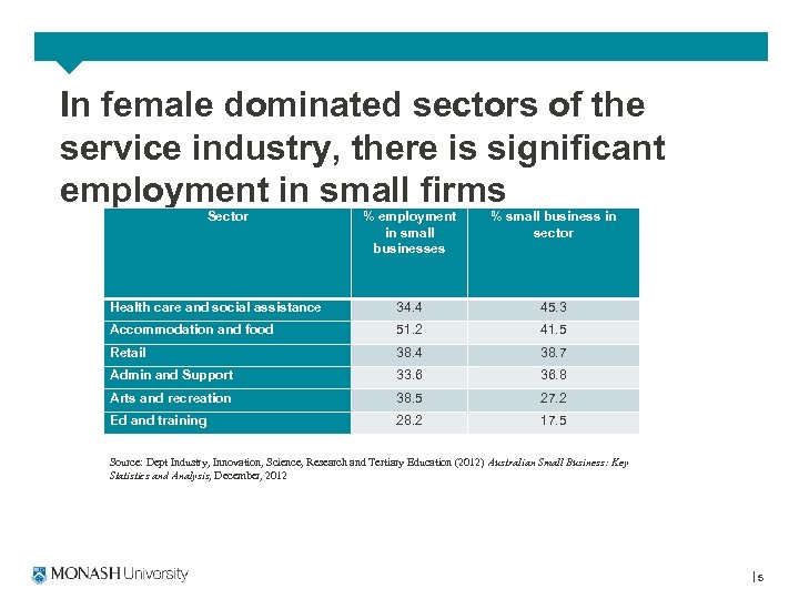 In female dominated sectors of the service industry, there is significant employment in small firms Sector % employment in small businesses % small business in sector Health care and social assistance 34. 4 45. 3 Accommodation and food 51. 2 41. 5 Retail 38. 4 38. 7 Admin and Support 33. 6 36. 8 Arts and recreation 38. 5 27. 2 Ed and training 28. 2 17. 5 Source: Dept Industry, Innovation, Science, Research and Tertiary Education (2012) Australian Small Business: Key Statistics and Analysis, December, 2012 5