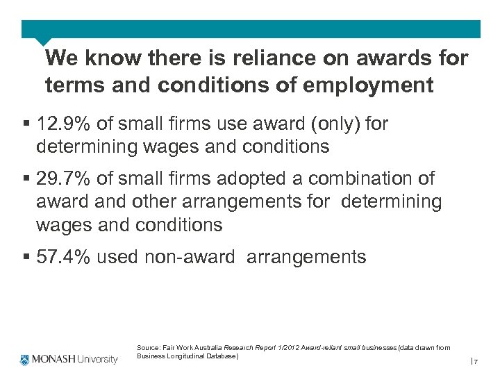 In terms of people management we know small firms…. § Are characterised by – Highly personalised management by owner-manager (Beaver and Jennings, 2005) – Employment relations and HR practices (where they exist) shaped by owner-managers’ values and perceptions (eg the sense they make of work and employment in the context of their firm and its environment) (Edwards et al, 2006; Baron and Hannan 2003 etc) – Informality in management practices (Barrett & Mayson) (can bring both positives and negatives to the firm (see Marlow et al 2009) – Employment relationship can be treated as an social relationship, rather than an economic relationship as a result of personal and familial ties and good communication between small group of employees and ownermanager – Stereotyped as being resistant to change/sensitive to cost increases and regulatory burden (see Barrett, Mayson & Bahn forthcoming) 6