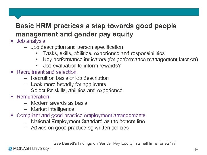 Basic HRM practices a step towards good people management and gender pay equity § Job analysis – Job description and person specification • Tasks, skills, abilities, experience and responsibilities • Key performance indicators (for performance management later on) • Job evaluation to inform rewards? § Recruitment and selection – Recruit on basis of job description – Look more broadly for applicants – Select for skills, abilities and experience § Remuneration – Modern awards as basis – Market intelligence § Compliant and good practice employment arrangements – National Employment Standard as the bottom line – Advice on good practice eg written policies See Barrett’s findings on Gender Pay Equity in Small firms for e. S 4 W 9
