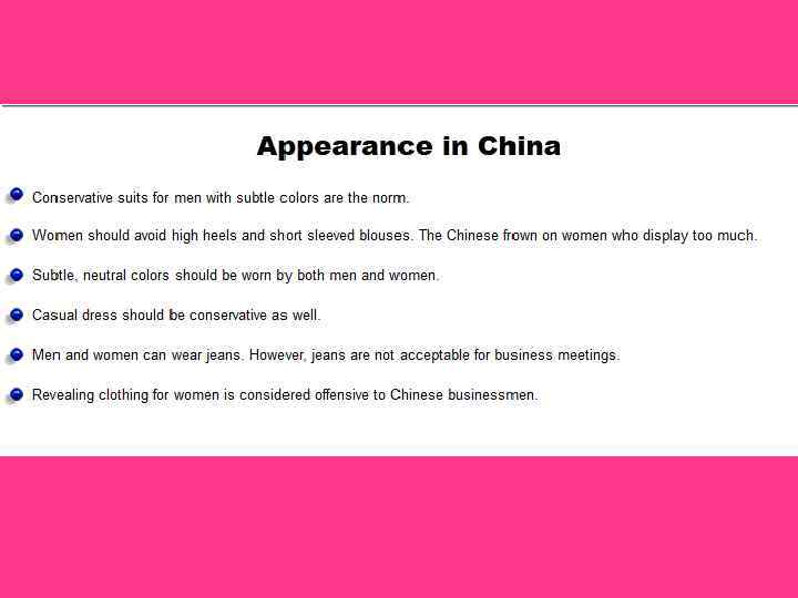 Presenting Gifts q A single large gift for the whole group, presented to leader during a meeting or banquet; or individual gifts to all participants, presented together with a major organization gift. q Present gift both hands as a sign of courtesy q Don’t expect gift to be opened unless specifically request q What to give: company gear with logos, local specialty products are appropriate gifts q What NOT to give: clock, green hat, white flowers and excessive value gift q Never wrap gift in WHITE or BLACK paper, sharp objects q Lucky numbers are 6 and 8 (especially in a series, such as 66 or 888). An unlucky number is 4.