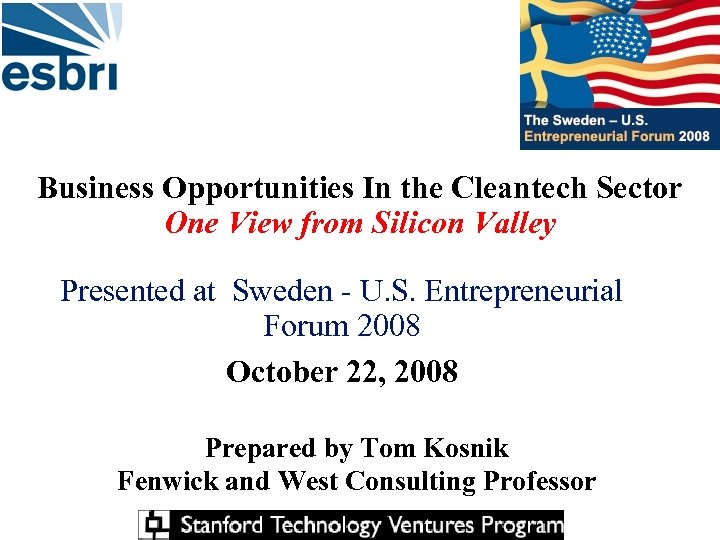 Business Opportunities In the Cleantech Sector One View from Silicon Valley Presented at Sweden - U. S. Entrepreneurial Forum 2008 October 22, 2008 Prepared by Tom Kosnik Fenwick and West Consulting Professor
