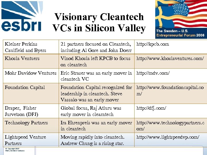 Visionary Cleantech VCs in Silicon Valley Kleiner Perkins Caulfield and Byers 21 partners focused on Cleantech, http: //kpcb. com including Al Gore and John Doerr Khosla Ventuers Vinod Khosla left KPCB to focus on cleantech http: //www. khoslaventures. com/ Mohr Davidow Ventures Eric Straser was an early mover in http: //mdv. com/ cleantech VC Foundation Capital recognized for http: //www. foundationcapital. co leadership in cleantech. Steve m/ Vassalo was an early mover Draper, Fisher Jurvetson (DFJ) Global focus, Raj Atluru was early mover in clearntech Technology Partners Ira Ehrenpreis was an early mover http: //www. technologypartners. c in cleantech om/ Lightspeed Venture Partners Moving rapidly into cleantech. Andrew Chung is a rising star. ® Copyright 2007 Mohr, Davidow Ventures http: //dfj. com/ http: //www. lightspeedvp. com/